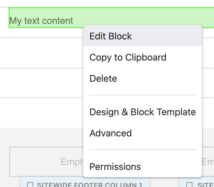 3. Click or tap on the block and from the context menu select **Edit Block**. Different block types have different editing controls. For general text content a *Content Block* is most often used. When Content blocks are edited the page content will become directly editable and a formatting toolbar will be presented above the content.&#x20;